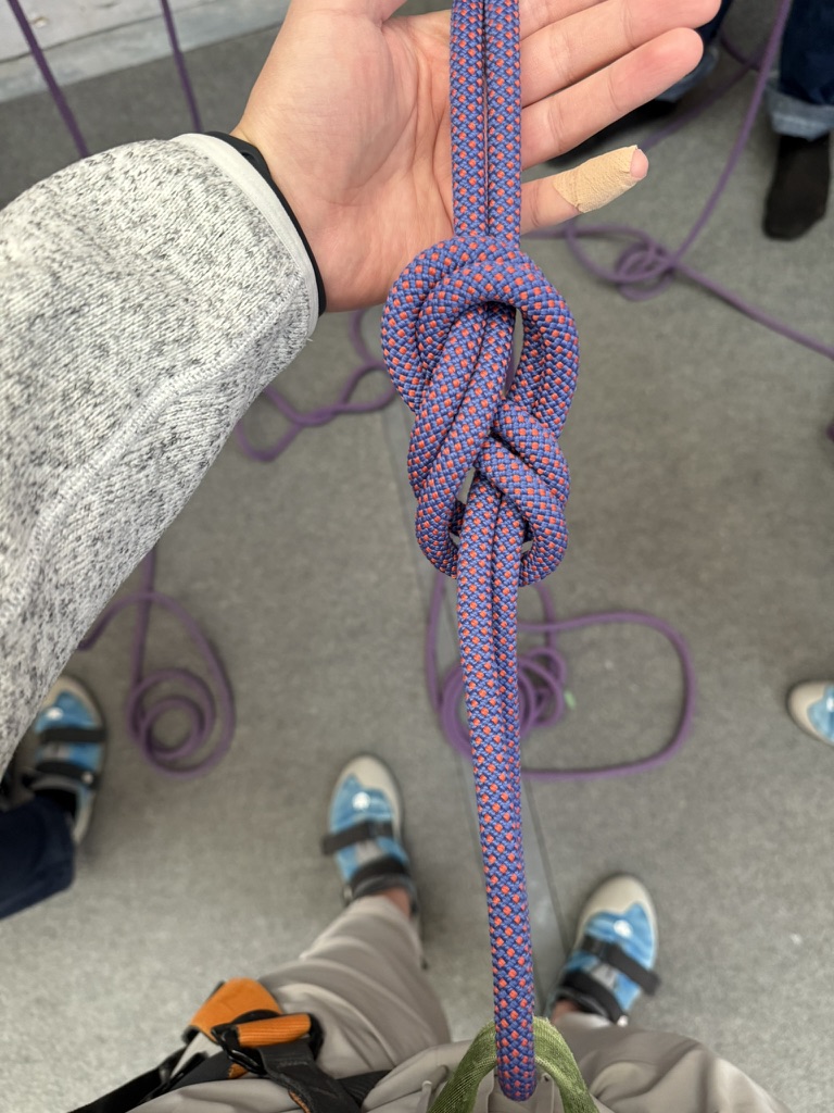2. The rope should be tied to the climber's harness using a figure-8 follow-though knot, leaving two fist-width of rope before a backup knot is tied.