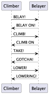 There's a simple handshake process akin to a network protocol where the climber and belayer start the procedure with "BELAY" and "BELAY ON". All the commands in the protocol expect acknowledgements from the receiver. In case of silence or ambiguity, the climber repeats the request until hearing a response. In emergency of a fall, the belayer will immediately engage the brake.